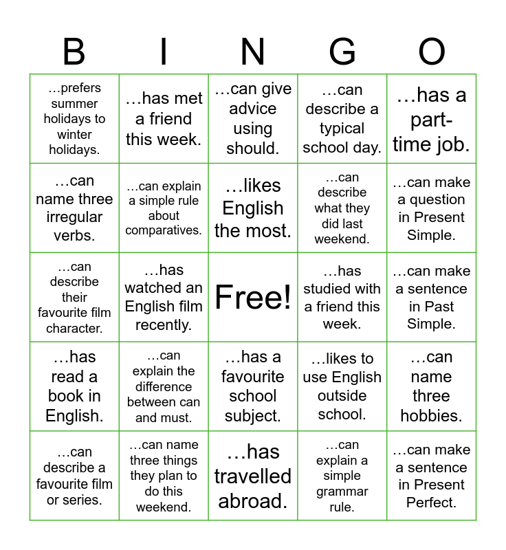 This bingo card has a free space and 41 words: …can make a sentence in Present Continuous., …can describe their favourite film character., …has written a short story in English., …can explain a simple rule about comparatives., …can name three things they plan to do this weekend., …has a favourite school subject., …likes English the most., …hates maths., …has a part-time job., …has read a book in English., …has watched an English film recently., …can describe a typical school day., …can make a sentence in Present Perfect., …can make a sentence in Past Simple., …has studied with a friend this week., …can explain the difference between can and must., …likes group activities in class., …prefers summer holidays to winter holidays., …has a dream holiday destination., …can give advice using should., …can name three hobbies., …likes football or volleyball., …has travelled abroad., …can describe what they did last weekend., …prefers reading to watching TV., …likes listening to podcasts in English., …can explain a simple grammar rule., …has completed homework today., …can make a question in Present Simple., …has celebrated a special event recently., …can say a famous quote in English., …has met a friend this week., …can describe a favourite film or series., …has tried a new sport or activity recently., …likes to use English outside school., …can name three irregular verbs., …can talk about a school project they enjoyed., …prefers studying alone to studying in a group., …can explain their favourite hobby in English., …can compare two things using comparatives. and …can make a sentence using “going to” for future plans..