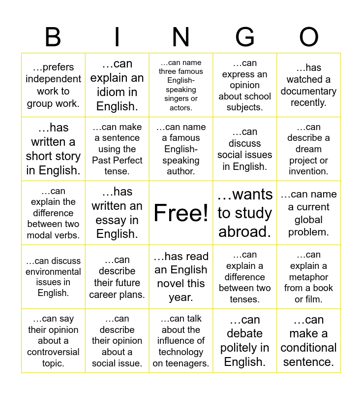This bingo card has a free space and 41 words: …can summarize a recent article in English., …can explain the difference between two modal verbs., …has discussed a controversial topic in English., …can make a sentence using the Past Perfect tense., …can describe their opinion about a social issue., …has read an English novel this year., …can name a famous English-speaking author., …can summarize a film plot in English., …has watched a documentary recently., …can discuss environmental issues in English., …has written an essay in English., …can express an opinion about school subjects., …can make a conditional sentence., …can name a current global problem., …wants to study abroad., …can describe their future career plans., …can give advice in English using should/must., …prefers independent work to group work., …has attended a cultural event this year., …can name three famous English-speaking singers or actors., …can explain a metaphor from a book or film., …can use at least three connectors in English (however, although…)., …can talk about the influence of technology on teenagers., …can discuss social issues in English., …can compare past and present experiences., …likes reading newspapers or online articles in English., …can debate politely in English., …can give a short presentation in English., …can describe a dream project or invention., …can use reported speech correctly., …can express a future intention using “will” or “going to”., …can explain an idiom in English., …can say their opinion about a controversial topic., …has analyzed a poem or song in English., …can explain a difference between two tenses., …has written a short story in English., …can summarize a text in three sentences., …can express agreement or disagreement politely., …can describe a famous historical figure., …has done research for an English project. and …can give three reasons for a personal opinion in English..
