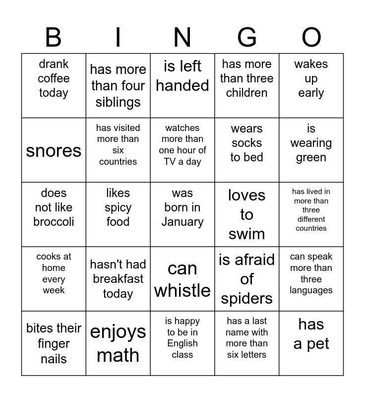 This bingo card has a free space and 24 words: hasn't had breakfast today, enjoys math, watches more than one hour of TV a day, bites their finger nails, wakes up early, drank coffee today, snores, has more than four siblings, loves to swim, can whistle, wears socks to bed, does not like broccoli, is afraid of spiders, can speak more than three languages, has visited more than six countries, has a last name with more than six letters, has lived in more than three different countries, is left handed, is wearing green, likes spicy food, has a pet, cooks at home every week, has more than three children and is happy to be in English class.