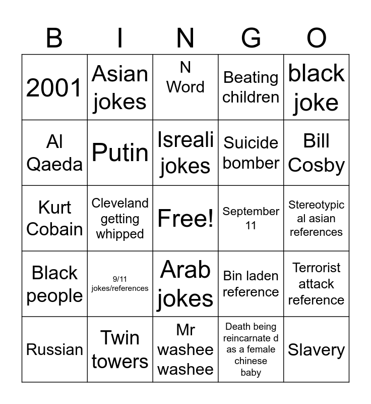 This bingo card has a free space and 24 words: 9/11 jokes/references, Twin towers, Isreali jokes, Russian, black joke, 2001, Al Qaeda, Asian jokes, September 11, Arab jokes, Suicide bomber, Kurt Cobain, Bin laden reference, Terrorist attack reference, Putin, Death being reincarnate d as a female chinese baby, Stereotypic al asian references, N Word, Bill Cosby, Cleveland getting whipped, Slavery, Black people, Beating children and Mr washee washee.