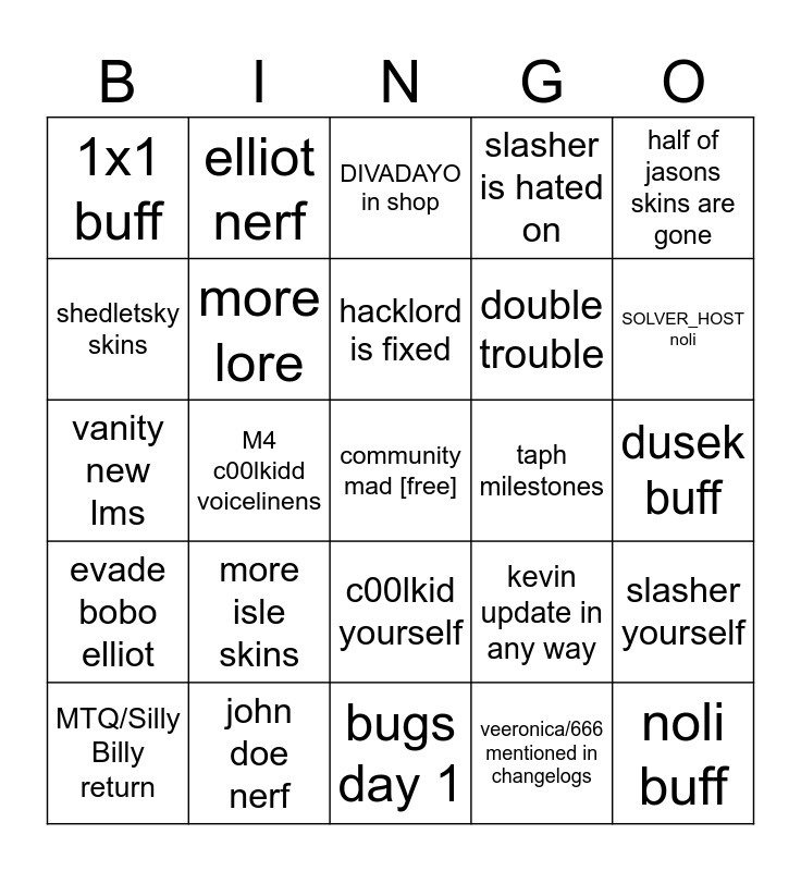 This bingo card has a free space and 24 words: more isle skins, john doe nerf, hacklord is fixed, MTQ/Silly Billy return, half of jasons skins are gone, 1x1 buff, shedletsky skins, elliot nerf, taph milestones, c00lkid yourself, double trouble, vanity new lms, kevin update in any way, slasher yourself, more lore, veeronica/666 mentioned in changelogs, dusek buff, DIVADAYO in shop, SOLVER_HOST noli, M4 c00lkidd voicelinens, noli buff, evade bobo elliot, slasher is hated on and bugs day 1.