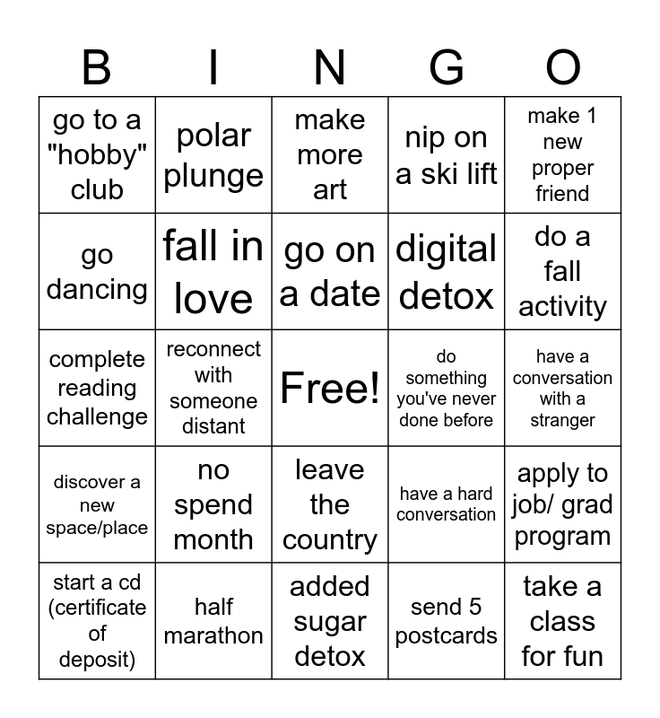 This bingo card has a free space and 24 words: no spend month, half marathon, go on a date, start a cd (certificate of deposit), make 1 new proper friend, go to a "hobby" club, go dancing, polar plunge, do something you've never done before, leave the country, digital detox, complete reading challenge, have a hard conversation, apply to job/ grad program, fall in love, send 5 postcards, have a conversation with a stranger, make more art, do a fall activity, reconnect with someone distant, take a class for fun, discover a new space/place, nip on a ski lift and added sugar detox.