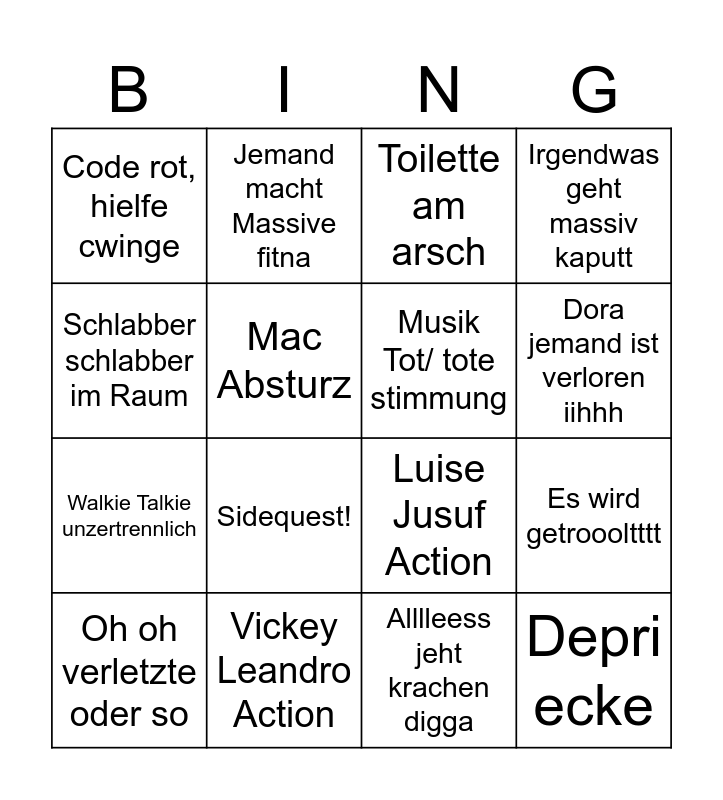 This bingo card has 16 words: Vickey Leandro Action, Es wird getroooltttt, Toilette am arsch, Code rot, hielfe cwinge, Walkie Talkie unzertrennlich, Jemand macht Massive fitna, Luise Jusuf Action, Alllleess jeht krachen digga, Schlabber schlabber im Raum, Mac Absturz, Oh oh verletzte oder so, Irgendwas geht massiv kaputt, Sidequest!, Dora jemand ist verloren iihhh, Musik Tot/ tote stimmung and Depri ecke.