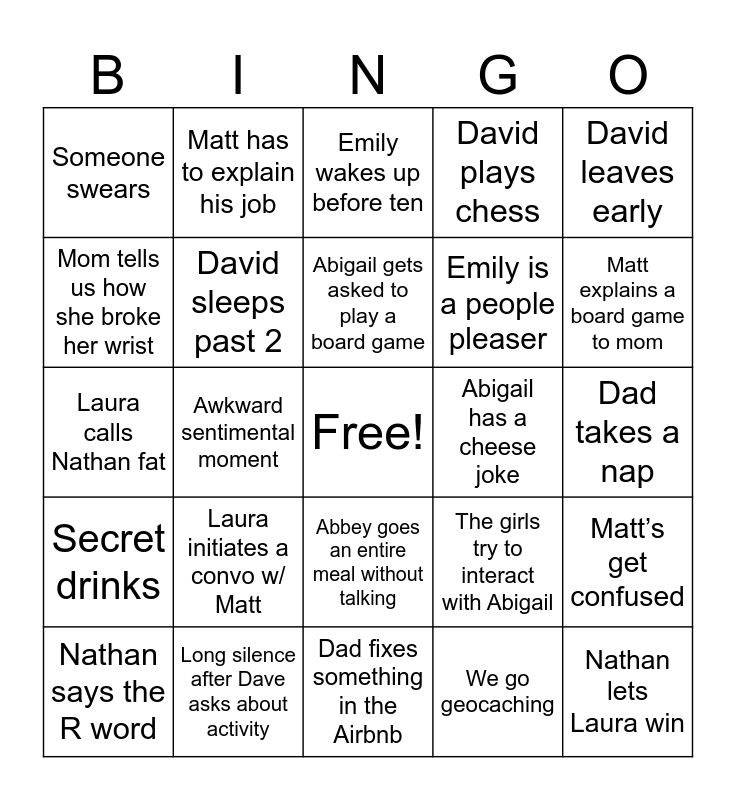 This bingo card has a free space and 24 words: Laura initiates a convo w/ Matt, Long silence after Dave asks about activity, Abigail gets asked to play a board game, Nathan says the R word, David leaves early, Someone swears, Mom tells us how she broke her wrist, Matt has to explain his job, Abigail has a cheese joke, Abbey goes an entire meal without talking, Emily is a people pleaser, Laura calls Nathan fat, The girls try to interact with Abigail, Matt’s get confused, David sleeps past 2, We go geocaching, Dad takes a nap, Emily wakes up before ten, Matt explains a board game to mom, Awkward sentimental moment, Nathan lets Laura win, Secret drinks, David plays chess and Dad fixes something in the Airbnb.