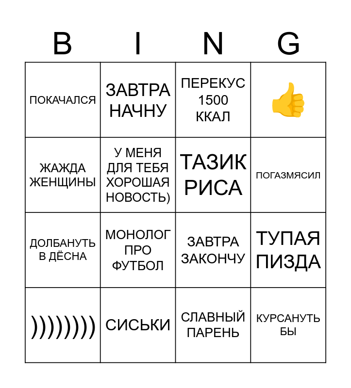 This bingo card has 16 words: СИСЬКИ, ТУПАЯ ПИЗДА, ПЕРЕКУС 1500 ККАЛ, ПОКАЧАЛСЯ, ДОЛБАНУТЬ В ДЁСНА, ЗАВТРА НАЧНУ, ЗАВТРА ЗАКОНЧУ, СЛАВНЫЙ ПАРЕНЬ, ЖАЖДА ЖЕНЩИНЫ, У МЕНЯ ДЛЯ ТЕБЯ ХОРОШАЯ НОВОСТЬ), )))))))), 👍, МОНОЛОГ ПРО ФУТБОЛ, ПОГАЗМЯСИЛ, ТАЗИК РИСА and КУРСАНУТЬ БЫ.