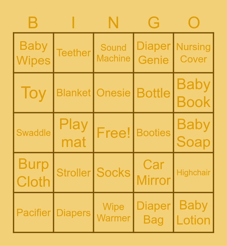 This bingo card has a free space and 24 words: Stroller, Diapers, Onesie, Pacifier, Nursing Cover, Baby Wipes, Toy, Teether, Booties, Socks, Bottle, Swaddle, Car Mirror, Highchair, Blanket, Diaper Bag, Baby Soap, Sound Machine, Baby Book, Play mat, Baby Lotion, Burp Cloth, Diaper Genie and Wipe Warmer.