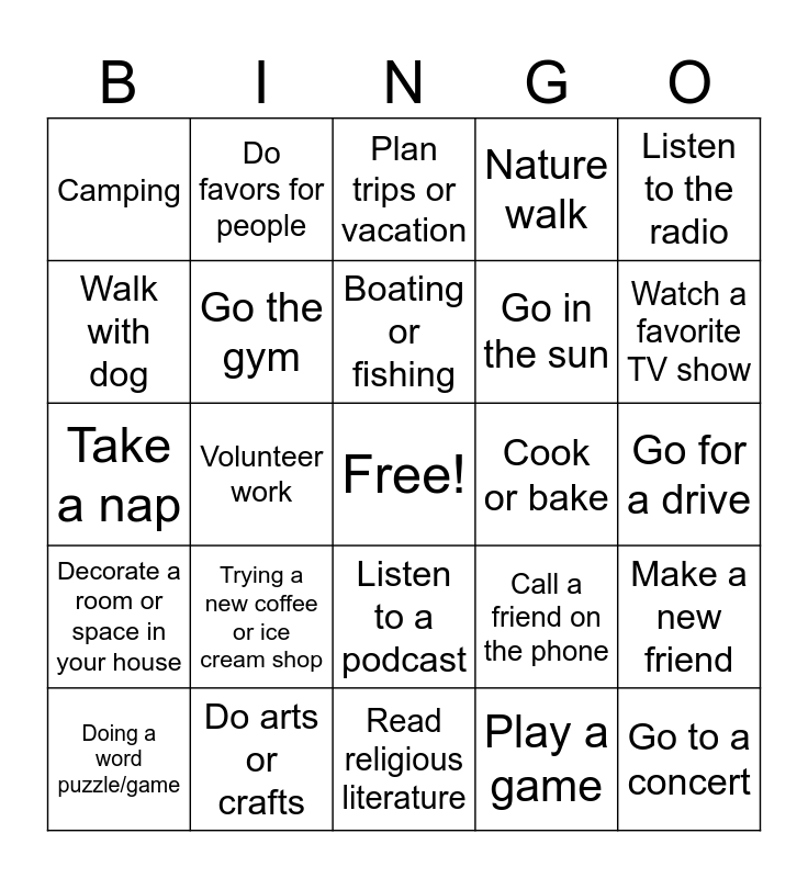 This bingo card has a free space and 24 words: Trying a new coffee or ice cream shop, Do arts or crafts, Boating or fishing, Doing a word puzzle/game, Listen to the radio, Camping, Walk with dog, Do favors for people, Cook or bake, Listen to a podcast, Go in the sun, Take a nap, Call a friend on the phone, Make a new friend, Go the gym, Play a game, Go for a drive, Plan trips or vacation, Watch a favorite TV show, Volunteer work, Go to a concert, Decorate a room or space in your house, Nature walk and Read religious literature.