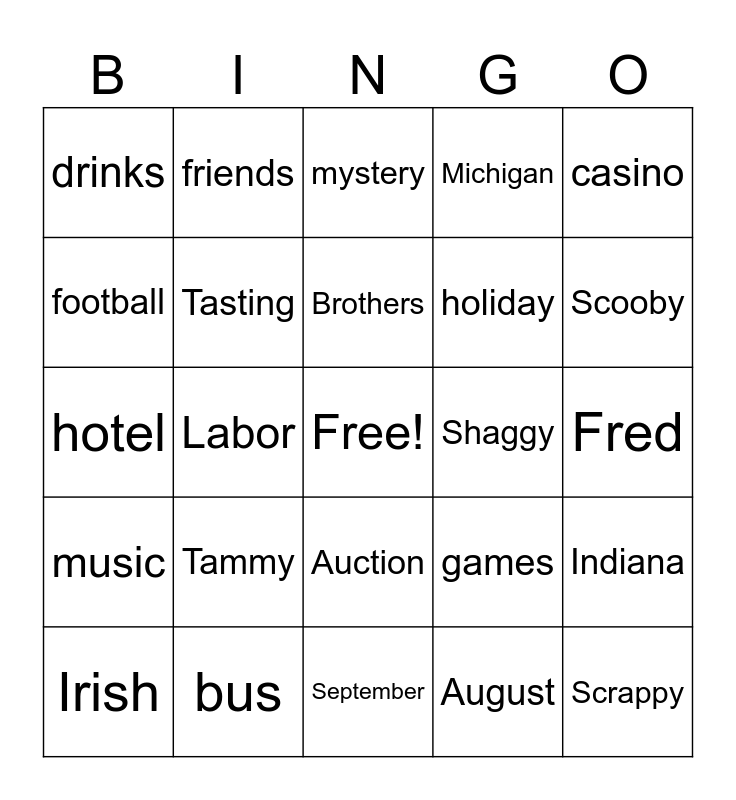 This bingo card has a free space and 26 words: Auction, August, Brothers, bus, casino, drinks, football, friends, Fred, games, holiday, hotel, Indiana, Irish, Labor, lights, Michigan, music, mystery, Scrappy, Scooby, September, Shaggy, Tammy, Tasting and winery.