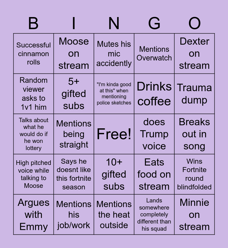 This bingo card has a free space and 24 words: Says he doesnt like this fortnite season, Mentions his job/work, "I'm kinda good at this" when mentioning police sketches, Argues with Emmy, Dexter on stream, Successful cinnamon rolls, Random viewer asks to 1v1 him, Moose on stream, does Trump voice, 10+ gifted subs, Drinks coffee, Talks about what he would do if he won lottery, Eats food on stream, Wins Fortnite round blindfolded, 5+ gifted subs, Lands somewhere completely different than his squad, Breaks out in song, Mutes his mic accidently, Trauma dump, Mentions being straight, Minnie on stream, High pitched voice while talking to Moose, Mentions Overwatch and Mentions the heat outside.