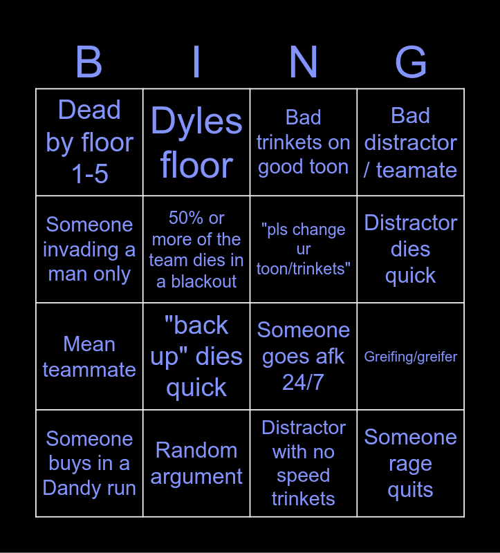 This bingo card has 16 words: Random argument, Greifing/greifer, Bad trinkets on good toon, Dead by floor 1-5, Mean teammate, Dyles floor, Someone goes afk 24/7, Distractor with no speed trinkets, Someone invading a man only, 50% or more of the team dies in a blackout, Someone buys in a Dandy run, Bad distractor / teamate, "back up" dies quick, Distractor dies quick, "pls change ur toon/trinkets" and Someone rage quits.