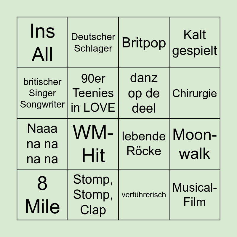 This bingo card has 16 words: Stomp, Stomp, Clap, Moon-walk, Britpop, Ins All, Naaa na na na na, Deutscher Schlager, lebende Röcke, verführerisch, britischer Singer Songwriter, 90er Teenies in LOVE, 8 Mile, Kalt gespielt, WM-Hit, Chirurgie, danz op de deel and Musical-Film.