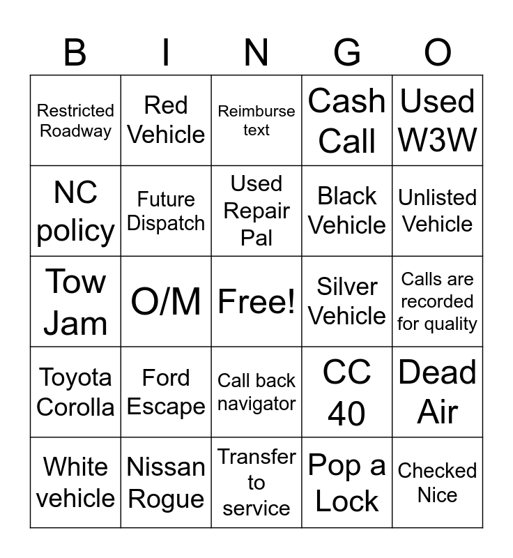 This bingo card has a free space and 24 words: White vehicle, Ford Escape, Used Repair Pal, Pop a Lock, Used W3W, Restricted Roadway, Red Vehicle, Reimburse text, Silver Vehicle, Calls are recorded for quality, Tow Jam, Future Dispatch, CC 40, Dead Air, NC policy, Nissan Rogue, Transfer to service, Cash Call, Unlisted Vehicle, Toyota Corolla, O/M, Call back navigator, Black Vehicle and Checked Nice.