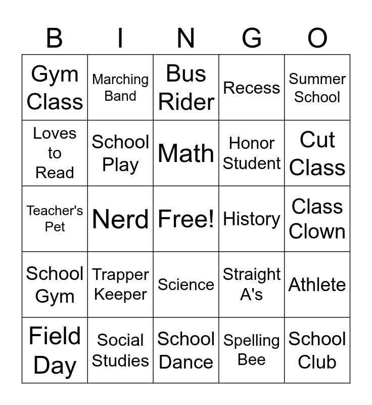This bingo card has a free space and 24 words: Trapper Keeper, Social Studies, Math, Field Day, Summer School, Gym Class, Loves to Read, Marching Band, History, Science, Honor Student, Teacher's Pet, Straight A's, Athlete, School Play, Spelling Bee, Class Clown, Bus Rider, Cut Class, Nerd, School Club, School Gym, Recess and School Dance.