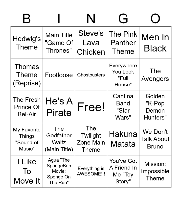This bingo card has a free space and 36 words: You're The One That I Want "Grease", Mrs. Robinson "The Graduate", (I've Had) The Time Of My Life "Dirty Dancing", Footloose, Hakuna Matata, My Favorite Things "Sound of Music", Ghostbusters, A Hard Day's Night, Men in Black, Space Jam, He's A Pirate, The Pink Panther Theme, Batman Theme "Batman", Cantina Band "Star Wars", The Avengers, Hedwig's Theme, Jaws, The Godfather Waltz (Main Title), Mission: Impossible Theme, Steve's Lava Chicken, Golden "K-Pop Demon Hunters", We Don't Talk About Bruno, Agua "The SpongeBob Movie: Sponge On The Run", I Like To Move It, Everything is AWESOME!!!, Main Title "Game Of Thrones", The Fresh Prince Of Bel-Air, I'll Be There For You "Friends", Everywhere You Look "Full House", Thomas Theme (Reprise), What's New Scooby-Doo, Monsters, Inc., You've Got A Friend In Me "Toy Story", The Twilight Zone Main Theme, Won't You Be My Neighbor and I'm A Believer "Shrek".