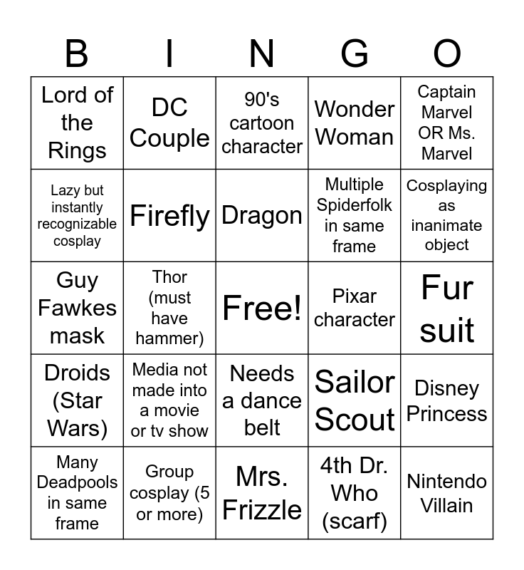 This bingo card has a free space and 57 words: Deadpool, Many Deadpools in same frame, Pokemon, Lord of the Rings, Mrs. Frizzle, Avatar: The Last Air Bender, Firefly, Spiderman(any), Multiple Spiderfolk in same frame, Rule 63 Superhero (genderswap), Wonder Woman, Monty Python reference, Pikachu, X-men, Small child as media older than them, Avenger (any), Captain Marvel OR Ms. Marvel, Thor (must have hammer), Pokemon OTHER than Pikachu, Nintendo Villain, Pixar character, Dr. Who character (any), Sailor Scout, 90's cartoon character, Fedora, Dragon, Prop larger than person (carried), Penguin (any), Cosplaying as inanimate object, Portal, Robin Hood, Kilt, Flogger, whip, or handcuffs, Mobility device as cosplay, Fur suit, Lazy but instantly recognizable cosplay, Actually wearing a dance belt, Guy Fawkes mask, Tentacles, Droids (Star Wars), DC Couple, Needs a dance belt, So much body paint, Marvel couple, Legend of Zelda, Monty Python reference, Media not made into a movie or tv show, Group cosplay (5 or more), Steampunk version of X, Superman, 80's children's cartoon, 4th Dr. Who (scarf), Robot (any), Anime (unknown by you), Thor (must have hammer), Disney Princess and Inflatable costume.