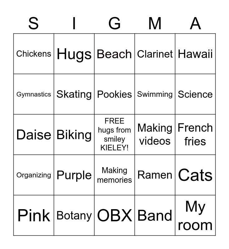 This bingo card has a free space and 24 words: Purple, Botany, Pookies, Pink, Hawaii, Chickens, Gymnastics, Hugs, Making videos, Making memories, Swimming, Daise, Ramen, Cats, Skating, Band, French fries, Beach, Science, Biking, My room, Organizing, Clarinet and OBX.