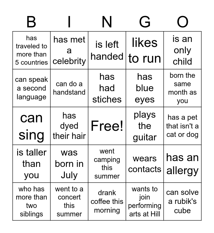 This bingo card has a free space and 25 words: was born in July, drank coffee this morning, has had stiches, who has more than two siblings, is an only child, has traveled to more than 5 countries, can speak a second language, has met a celebrity, plays the guitar, went camping this summer, has blue eyes, can sing, wears contacts, has an allergy, can do a handstand, likes to ice skate, has a pet that isn't a cat or dog, is left handed, born the same month as you, has dyed their hair, can solve a rubik's cube, went to a concert this summer, is taller than you, likes to run and wants to join performing arts at Hill.