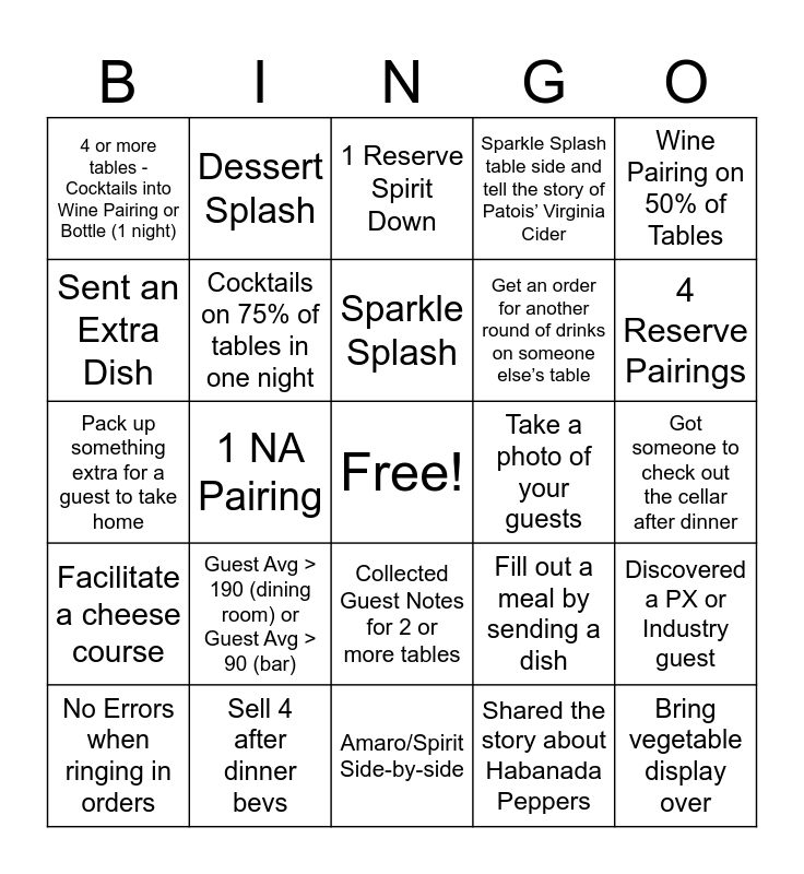 This bingo card has a free space and 24 words: Guest Avg > 190 (dining room) or Guest Avg > 90 (bar), Sell 4 after dinner bevs, Sparkle Splash, No Errors when ringing in orders, Wine Pairing on 50% of Tables, 4 or more tables - Cocktails into Wine Pairing or Bottle (1 night), Sent an Extra Dish, Dessert Splash, Take a photo of your guests, Collected Guest Notes for 2 or more tables, Get an order for another round of drinks on someone else’s table, Pack up something extra for a guest to take home, Fill out a meal by sending a dish, Discovered a PX or Industry guest, Cocktails on 75% of tables in one night, Shared the story about Habanada Peppers, Got someone to check out the cellar after dinner, 1 Reserve Spirit Down, 4 Reserve Pairings, 1 NA Pairing, Bring vegetable display over, Facilitate a cheese course, Sparkle Splash table side and tell the story of Patois’ Virginia Cider and Amaro/Spirit Side-by-side.