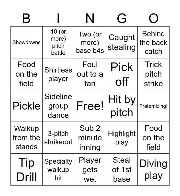 This bingo card has a free space and 32 words: Steal of 1st base, Perfect inning, Sideline group dance, Double trick play, Walkup from the stands, Shirtless player, Behind the back catch, Food on the field, 10 (or more) pitch battle, One pitch, one out, Foul out to a fan, Two (or more) base b4s, Technical issues, Homerun, Hit by pitch, Stolen base, Tip Drill, Pickle, Sub 2 minute inning, 3-pitch shrikeout, Highlight play, Trick play missed, Fraternizing!, Specialty walkup hit, Diving play, Caught stealing, Pick off, Food on the field, Showdowns, Player gets wet, Backflip catch and Trick pitch strike.