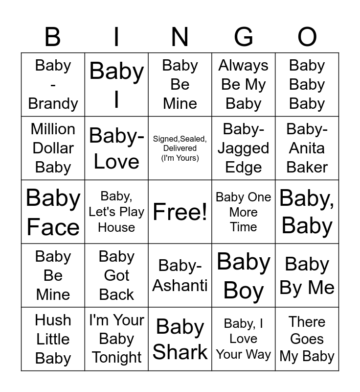 This bingo card has a free space and 24 words: Baby Got Back, I'm Your Baby Tonight, Signed,Sealed, Delivered (I'm Yours), Hush Little Baby, Baby Baby Baby, Baby -Brandy, Million Dollar Baby, Baby I, Baby One More Time, Baby-Ashanti, Baby-Jagged Edge, Baby Face, Baby Boy, Baby By Me, Baby- Love, Baby, I Love Your Way, Baby, Baby, Baby Be Mine, Baby-Anita Baker, Baby, Let's Play House, There Goes My Baby, Baby Be Mine, Always Be My Baby and Baby Shark.