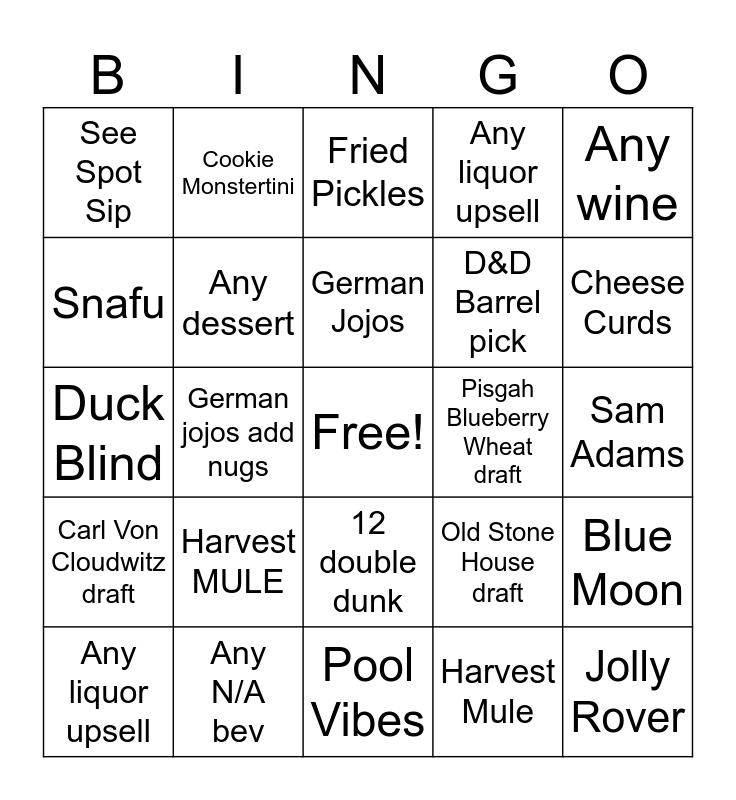 This bingo card has a free space and 24 words: Harvest MULE, Any N/A bev, German Jojos, Any liquor upsell, Any wine, See Spot Sip, Snafu, Cookie Monstertini, Pisgah Blueberry Wheat draft, 12 double dunk, D&D Barrel pick, Duck Blind, Old Stone House draft, Blue Moon, Any dessert, Harvest Mule, Sam Adams, Fried Pickles, Cheese Curds, German jojos add nugs, Jolly Rover, Carl Von Cloudwitz draft, Any liquor upsell and Pool Vibes.