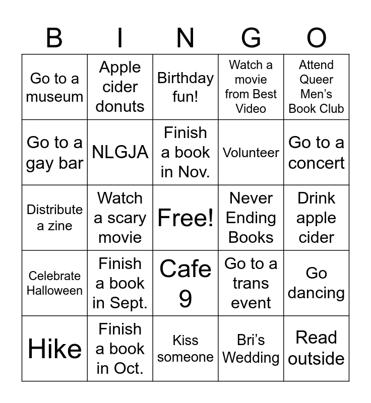 This bingo card has a free space and 24 words: Finish a book in Sept., Finish a book in Oct., Finish a book in Nov., Hike, Attend Queer Men’s Book Club, Go to a museum, Go to a gay bar, Apple cider donuts, Never Ending Books, Cafe 9, Volunteer, Distribute a zine, Go to a trans event, Go dancing, NLGJA, Bri’s Wedding, Drink apple cider, Birthday fun!, Go to a concert, Watch a scary movie, Read outside, Celebrate Halloween, Watch a movie from Best Video and Kiss someone.
