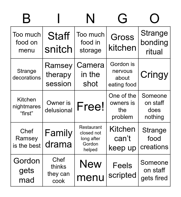 This bingo card has a free space and 29 words: Gordon gets mad, Gordon dramatically walks out, Owner is delusional, Food was frozen, Too much food on menu, Too much food in storage, Ramsey therapy session, Family drama, One of the owners is the problem, Chef thinks they can cook, Someone on staff does nothing, Someone on staff gets fired, New menu, Feels scripted, Cringy, Owner realization moment, Restaurant closed not long after Gordon helped, Chef Ramsey is the best, Strange bonding ritual, Kitchen nightmares “first”, Kitchen can’t keep up, Food is dry, Gordon is nervous about eating food, Strange decorations, Gross kitchen, Staff snitch, Strange food creations, Camera in the shot and No restaurant experience.