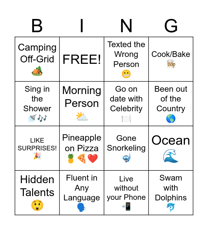 This bingo card has 16 words: Fluent in Any Language🗣️, Ocean🌊, Texted the Wrong Person 😬, Camping Off-Grid🏕️, LIKE SURPRISES!🎉, FREE!, Gone Snorkeling🤿, Live without your Phone 📲, Sing in the Shower 🚿🎶, Morning Person⛅️, Hidden Talents😲, Cook/Bake👩🏼🍳, Pineapple on Pizza🍍🍕❤️, Been out of the Country 🌎, Go on date with Celebrity 🍽️ and Swam with Dolphins 🐬.