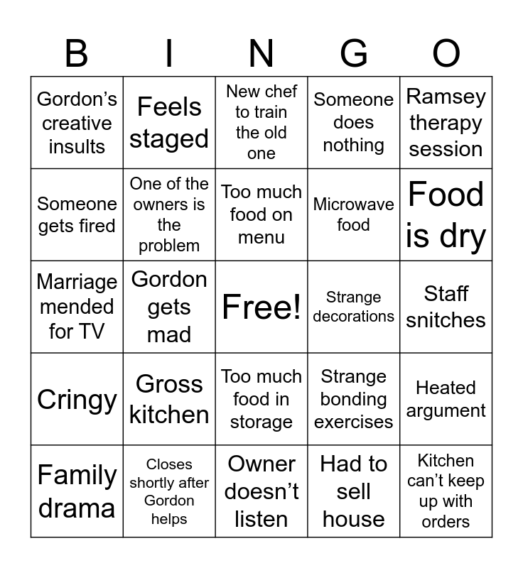 This bingo card has a free space and 39 words: The owner is delusional, Way in debt, Someone cries, One of the owners is the problem, Family drama, Too much food in storage, Too much food on menu, Strange food creations, Ramsey therapy session, Cringy, Gordon gets mad, Someone does nothing, Kitchen can’t keep up with orders, Staff snitches, Strange decorations, Gross kitchen, Chef thinks they can cook, Gordon’s creative insults, Gordon walks out dramatically, Strange bonding exercises, Someone gets fired, Owner doesn’t listen, Microwave food, Food is dry, Long wait time, Gordon is afraid to eat the food, Gordon shuts down the restaurant, No restaurant experience, Unsanitary food storage, Feels staged, Dramatic shots, Frozen food, New chef to train the old one, Closes shortly after Gordon helps, Had to sell house, Chef with no experience, Heated argument, Marriage mended for TV and Gordon in awe of owner’s craziness.