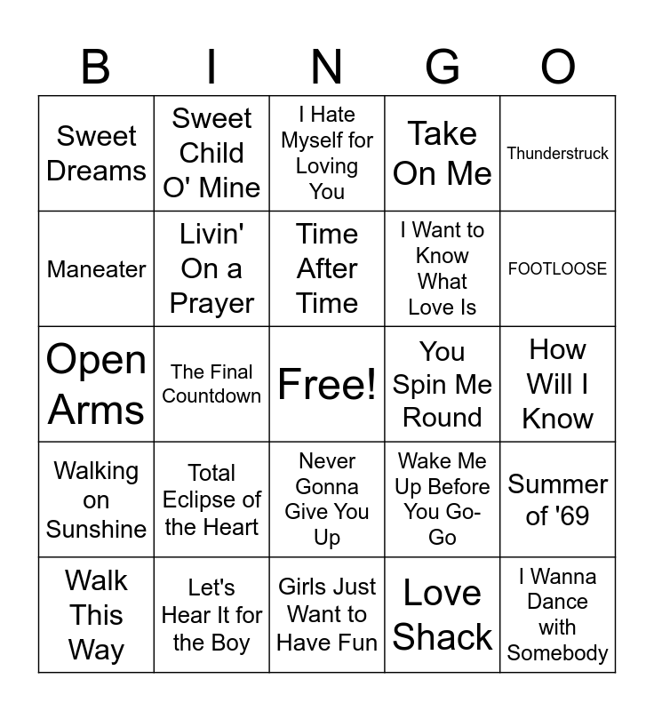 This bingo card has a free space and 49 words: Don't Stop Believin', I Wanna Dance with Somebody, Danger Zone, Girls Just Want to Have Fun, Total Eclipse of the Heart, Like a Prayer, Sweet Child O' Mine, Billie Jean, Maneater, We Didn't Start the Fire, Livin' On a Prayer, Take On Me, Summer of '69, Wake Me Up Before You Go-Go, Welcome to the Jungle, Beat It, Time After Time, You Spin Me Round, You Give Love a Bad Name, Thunderstruck, The Final Countdown, Love Shack, Sweet Dreams, I Want to Know What Love Is, Everybody Wants to Rule the World, FOOTLOOSE, Walk This Way, With or Without You, Never Gonna Give You Up, Walking on Sunshine, You Can Call Me Al, Any Way You Want It, Poison, Jessie's Girl, Let's Hear It for the Boy, Sexual Healing, Smooth Operator, Keep On Loving You, How Will I Know, It's Still Rock and Roll to Me, I'm So Excited, Glory Days, It's Tricky, Eternal Flame, Open Arms, I Hate Myself for Loving You, Saving All My Love For You, Private Eyes and Cult of Personality.