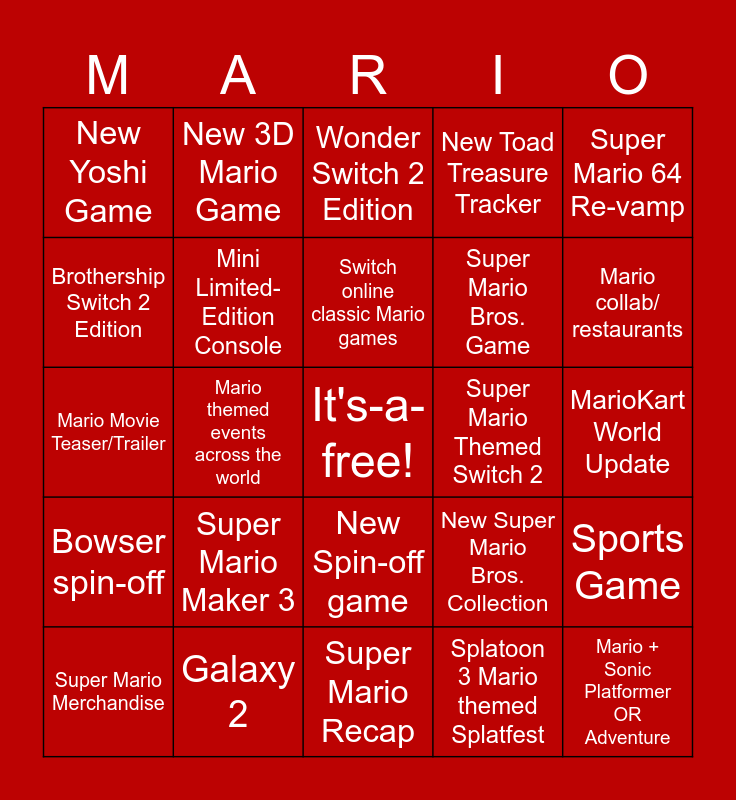 This bingo card has a free space and 24 words: Super Mario Maker 3, Galaxy 2, Switch online classic Mario games, Super Mario Merchandise, Super Mario 64 Re-vamp, New Yoshi Game, Brothership Switch 2 Edition, New 3D Mario Game, Super Mario Themed Switch 2, New Spin-off game, Super Mario Bros. Game, Mario Movie Teaser/Trailer, New Super Mario Bros. Collection, Sports Game, Mini Limited-Edition Console, Splatoon 3 Mario themed Splatfest, MarioKart World Update, Wonder Switch 2 Edition, Mario collab/ restaurants, Mario themed events across the world, Mario + Sonic Platformer OR Adventure, Bowser spin-off, New Toad Treasure Tracker and Super Mario Recap.