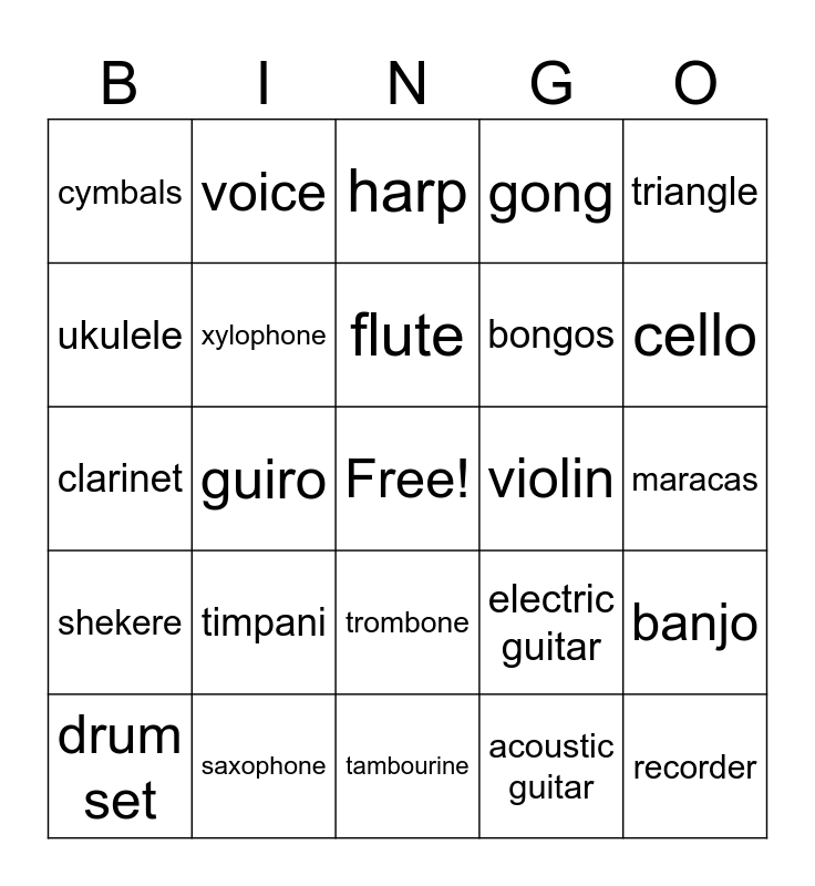 This bingo card has a free space and 34 words: trumpet, acoustic guitar, piano, castanets, shekere, xylophone, triangle, drum set, voice, oboe, flute, harp, snare, bassoon, violin, cello, saxophone, clarinet, timpani, electric guitar, trombone, french horn, cymbals, maracas, tambourine, recorder, gong, claves, bongos, ukulele, egg shaker, guiro, banjo and tuba.