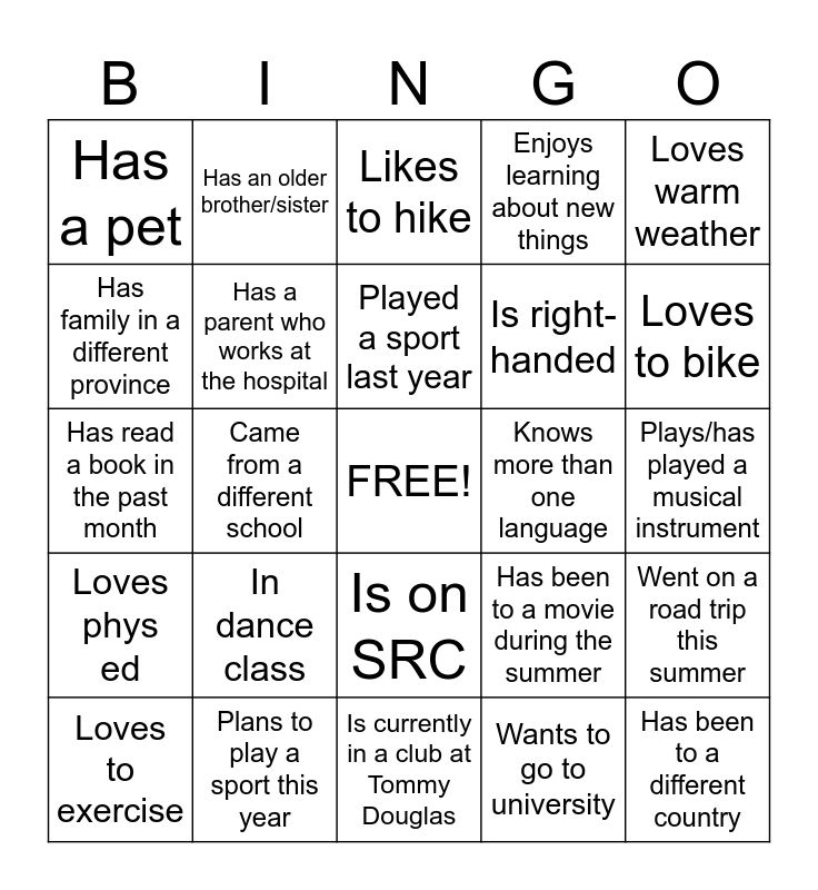 This bingo card has a free space and 24 words: In dance class, Plans to play a sport this year, Played a sport last year, Loves to exercise, Loves warm weather, Has a pet, Has family in a different province, Has an older brother/sister, Knows more than one language, Is on SRC, Is right-handed, Has read a book in the past month, Has been to a movie during the summer, Went on a road trip this summer, Has a parent who works at the hospital, Wants to go to university, Plays/has played a musical instrument, Likes to hike, Loves to bike, Came from a different school, Has been to a different country, Loves phys ed, Enjoys learning about new things and Is currently in a club at Tommy Douglas.