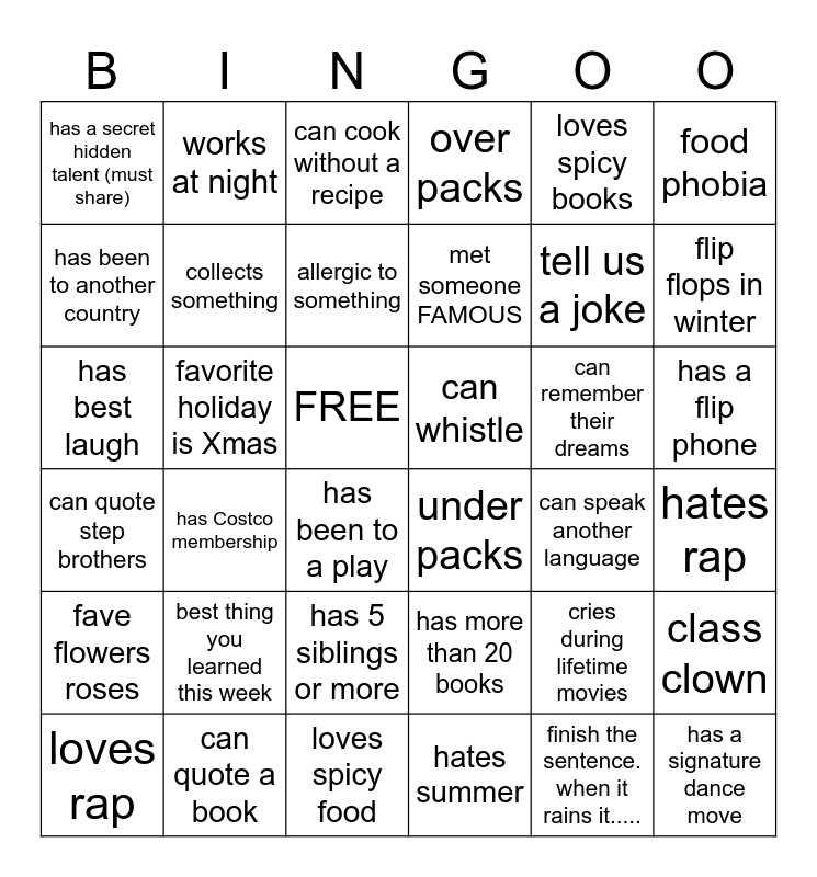 This bingo card has 36 words: has more than 20 books, has 5 siblings or more, hates summer, has been to another country, can quote step brothers, can whistle, collects something, loves spicy food, loves spicy books, cries during lifetime movies, flip flops in winter, over packs, class clown, favorite holiday is Xmas, met someone FAMOUS, has a secret hidden talent (must share), fave flowers roses, can remember their dreams, has best laugh, can cook without a recipe, FREE, has Costco membership, under packs, has been to a play, can speak another language, works at night, tell us a joke, can quote a book, allergic to something, food phobia, has a signature dance move, loves rap, hates rap, has a flip phone, best thing you learned this week and finish the sentence. when it rains it......