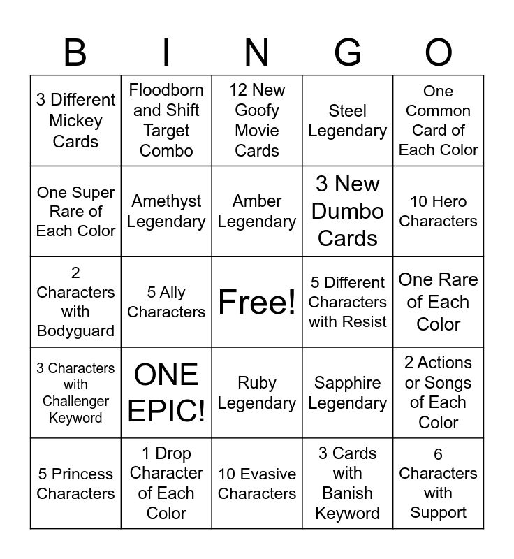 This bingo card has a free space and 24 words: ONE EPIC!, 1 Drop Character of Each Color, Amber Legendary, 5 Princess Characters, One Common Card of Each Color, 3 Different Mickey Cards, One Super Rare of Each Color, Floodborn and Shift Target Combo, 5 Different Characters with Resist, Ruby Legendary, 3 New Dumbo Cards, 2 Characters with Bodyguard, Sapphire Legendary, 2 Actions or Songs of Each Color, Amethyst Legendary, 3 Cards with Banish Keyword, One Rare of Each Color, 12 New Goofy Movie Cards, 10 Hero Characters, 5 Ally Characters, 6 Characters with Support, 3 Characters with Challenger Keyword, Steel Legendary and 10 Evasive Characters.