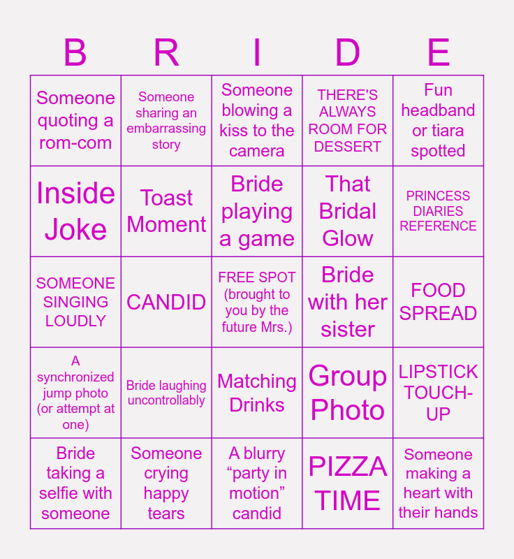This bingo card has a free space and 24 words: Bride laughing uncontrollably, Someone crying happy tears, Bride playing a game, Bride taking a selfie with someone, Fun headband or tiara spotted, Someone quoting a rom-com, Inside Joke, Someone sharing an embarrassing story, Bride with her sister, Matching Drinks, That Bridal Glow, SOMEONE SINGING LOUDLY, Group Photo, LIPSTICK TOUCH-UP, Toast Moment, PIZZA TIME, FOOD SPREAD, Someone blowing a kiss to the camera, PRINCESS DIARIES REFERENCE, CANDID, Someone making a heart with their hands, A synchronized jump photo (or attempt at one), THERE'S ALWAYS ROOM FOR DESSERT and A blurry “party in motion” candid.