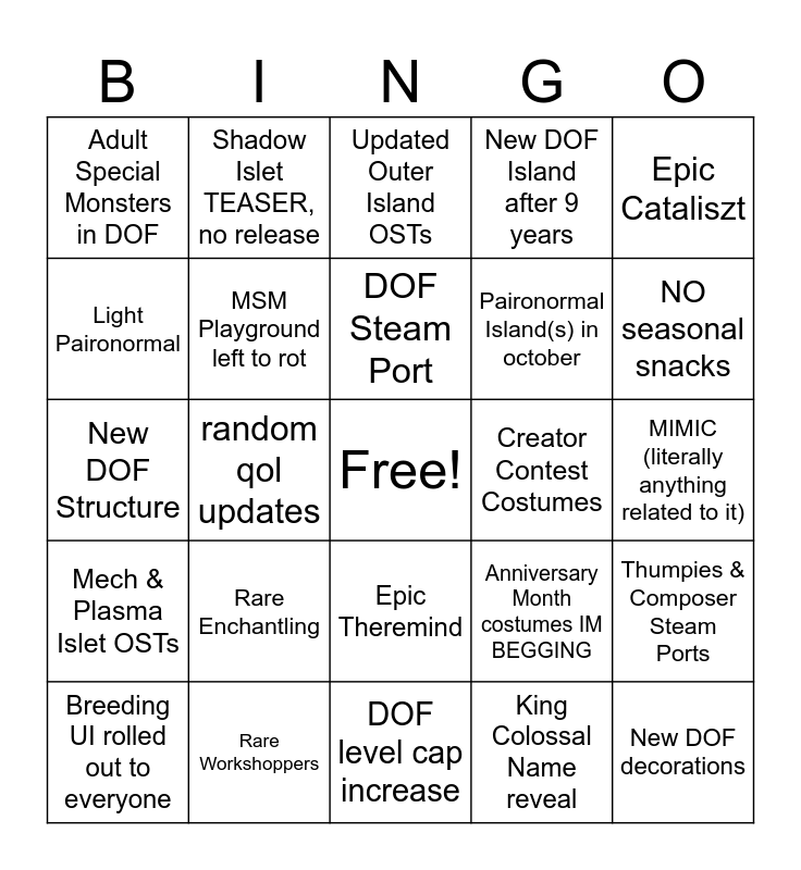 This bingo card has a free space and 24 words: Rare Enchantling, Rare Workshoppers, DOF Steam Port, Breeding UI rolled out to everyone, Epic Cataliszt, Adult Special Monsters in DOF, Light Paironormal, Shadow Islet TEASER, no release, Creator Contest Costumes, Epic Theremind, Paironormal Island(s) in october, New DOF Structure, Anniversary Month costumes IM BEGGING, Thumpies & Composer Steam Ports, MSM Playground left to rot, King Colossal Name reveal, MIMIC (literally anything related to it), Updated Outer Island OSTs, NO seasonal snacks, random qol updates, New DOF decorations, Mech & Plasma Islet OSTs, New DOF Island after 9 years and DOF level cap increase.