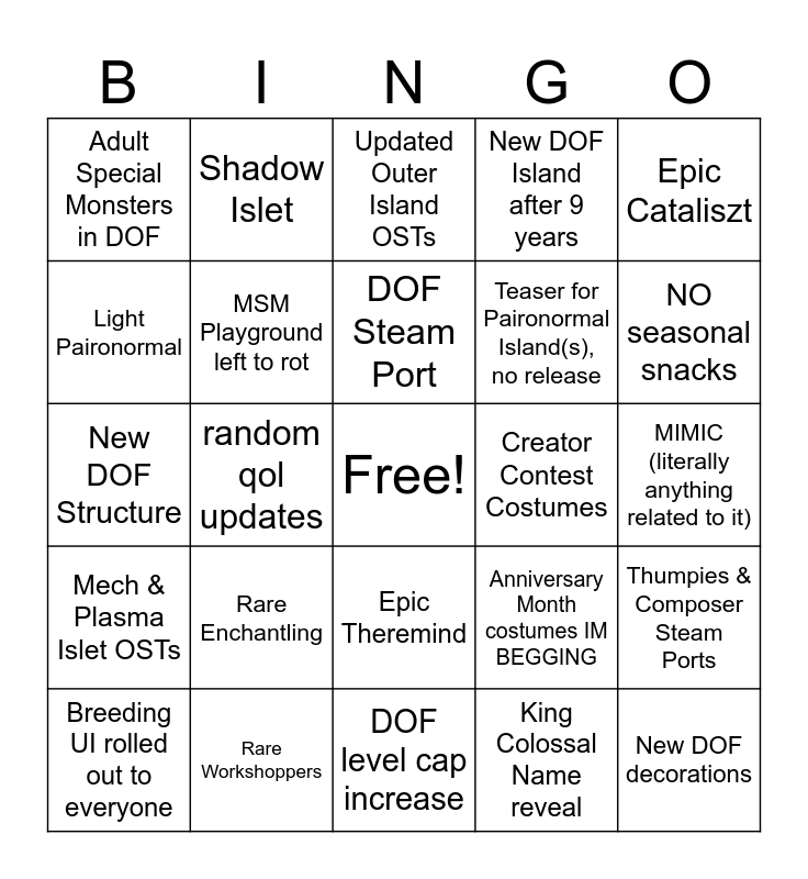 This bingo card has a free space and 24 words: Rare Enchantling, Rare Workshoppers, DOF Steam Port, Breeding UI rolled out to everyone, Epic Cataliszt, Adult Special Monsters in DOF, Light Paironormal, Shadow Islet, Creator Contest Costumes, Epic Theremind, Teaser for Paironormal Island(s), no release, New DOF Structure, Anniversary Month costumes IM BEGGING, Thumpies & Composer Steam Ports, MSM Playground left to rot, King Colossal Name reveal, MIMIC (literally anything related to it), Updated Outer Island OSTs, NO seasonal snacks, random qol updates, New DOF decorations, Mech & Plasma Islet OSTs, New DOF Island after 9 years and DOF level cap increase.