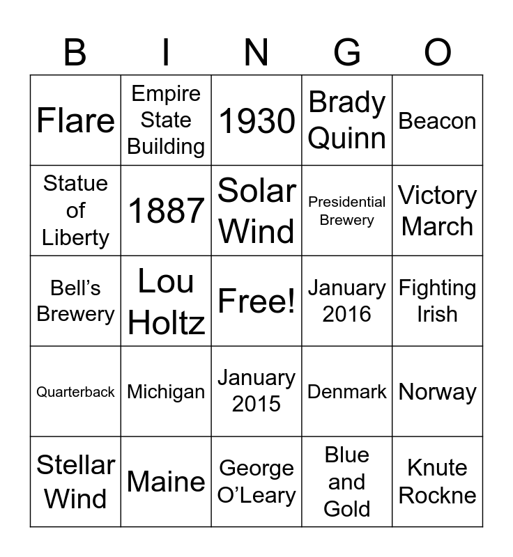 This bingo card has a free space and 24 words: Michigan, Maine, Solar Wind, Stellar Wind, Beacon, Flare, Statue of Liberty, Empire State Building, January 2016, January 2015, Presidential Brewery, Bell’s Brewery, Denmark, Norway, 1887, Blue and Gold, Fighting Irish, 1930, Victory March, Lou Holtz, Knute Rockne, Quarterback, Brady Quinn and George O’Leary.