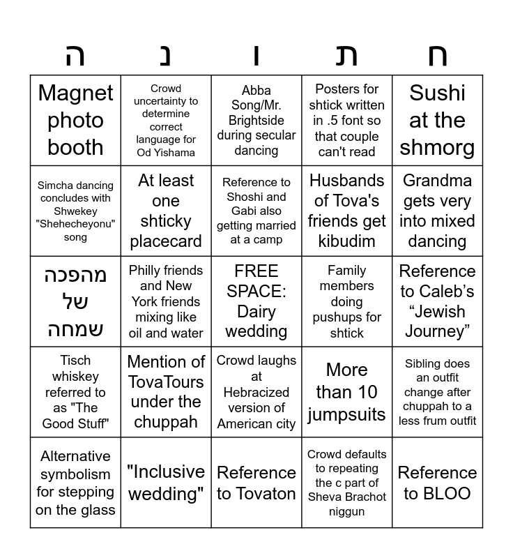 This bingo card has a free space and 24 words: Mention of TovaTours under the chuppah, "Inclusive wedding", Reference to Shoshi and Gabi also getting married at a camp, Alternative symbolism for stepping on the glass, Sushi at the shmorg, Magnet photo booth, Simcha dancing concludes with Shwekey "Shehecheyonu" song, Crowd uncertainty to determine correct language for Od Yishama, Family members doing pushups for shtick, Crowd laughs at Hebracized version of American city, Husbands of Tova's friends get kibudim, מהפכה של שמחה, More than 10 jumpsuits, Sibling does an outfit change after chuppah to a less frum outfit, At least one shticky placecard, Crowd defaults to repeating the c part of Sheva Brachot niggun, Reference to Caleb’s “Jewish Journey”, Abba Song/Mr. Brightside during secular dancing, Grandma gets very into mixed dancing, Philly friends and New York friends mixing like oil and water, Reference to BLOO, Tisch whiskey referred to as "The Good Stuff", Posters for shtick written in .5 font so that couple can't read and Reference to Tovaton.