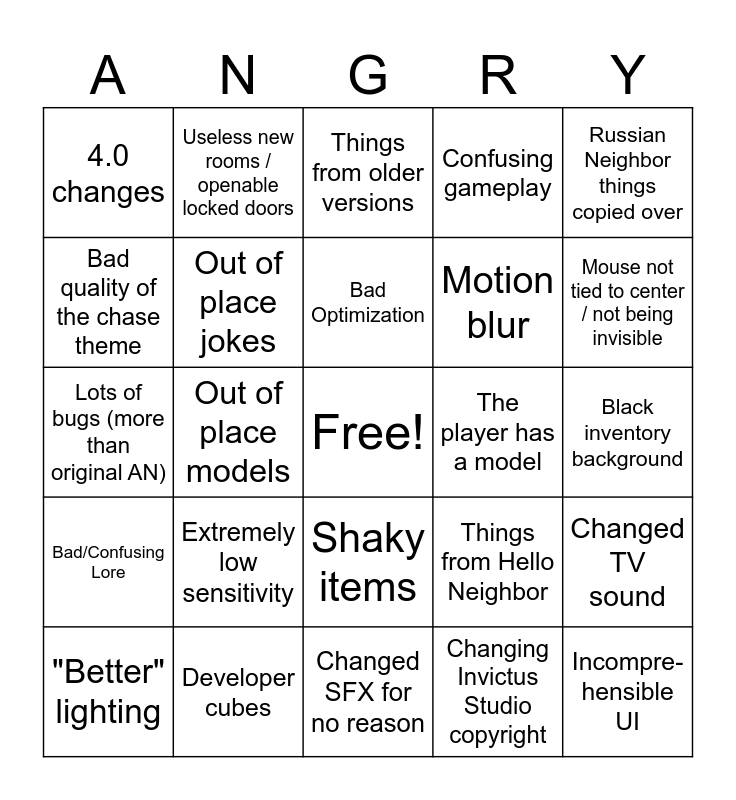 This bingo card has a free space and 24 words: Extremely low sensitivity, Developer cubes, Bad Optimization, "Better" lighting, Russian Neighbor things copied over, 4.0 changes, Bad quality of the chase theme, Useless new rooms / openable locked doors, The player has a model, Shaky items, Motion blur, Lots of bugs (more than original AN), Things from Hello Neighbor, Changed TV sound, Out of place jokes, Changing Invictus Studio copyright, Black inventory background, Things from older versions, Mouse not tied to center / not being invisible, Out of place models, Incompre-hensible UI, Bad/Confusing Lore, Confusing gameplay and Changed SFX for no reason.