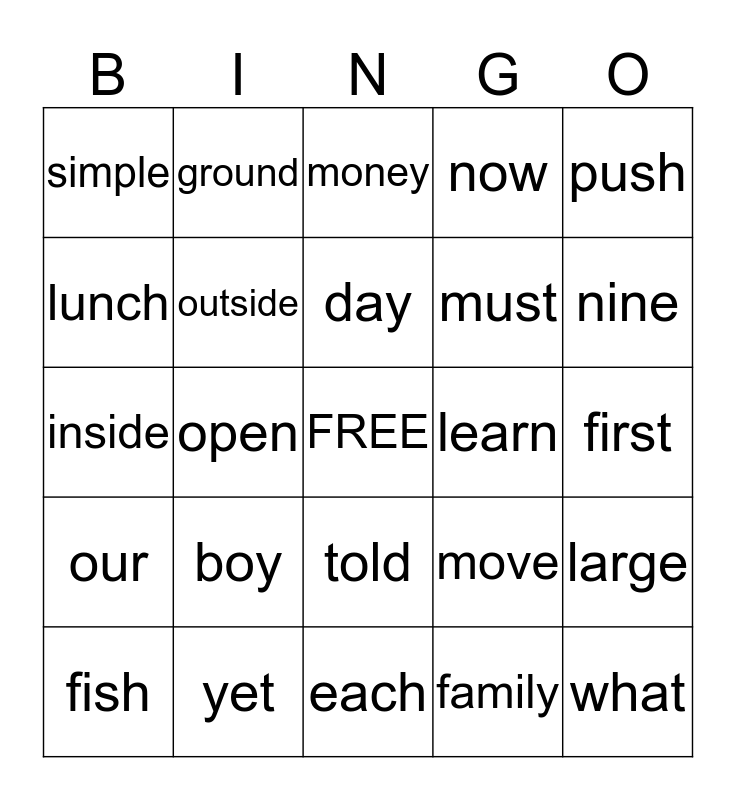 This bingo card has a free space and 25 words: boy, each, day, fish, push, simple, lunch, ground, learn, told, must, inside, move, large, outside, eat, first, money, nine, open, what, yet, our, now and family.