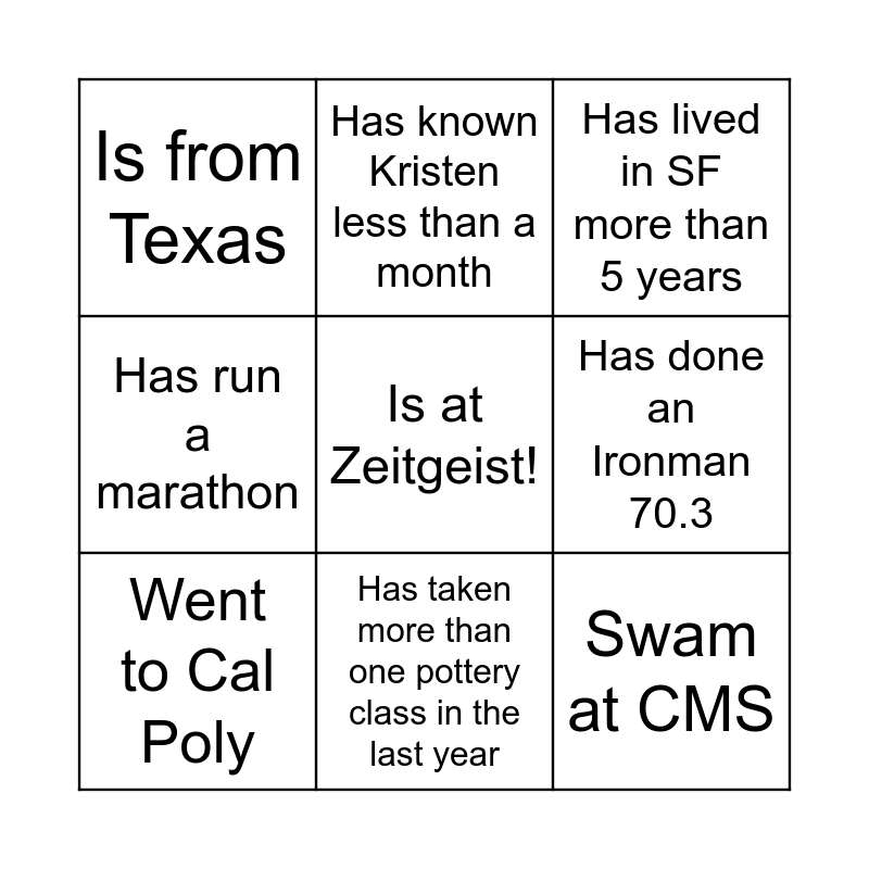 This bingo card has a free space and 8 words: Has done an Ironman 70.3, Has lived in SF more than 5 years, Has known Kristen less than a month, Went to Cal Poly, Is from Texas, Swam at CMS, Has run a marathon and Has taken more than one pottery class in the last year.