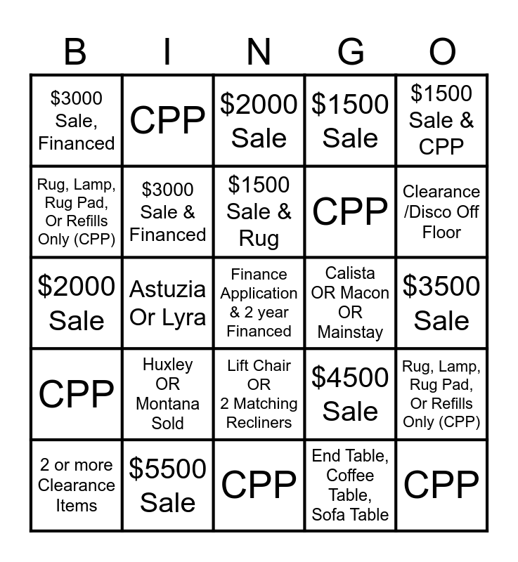 This bingo card has 25 words: CPP, $5500 Sale, Finance Application & 2 year Financed, End Table, Coffee Table, Sofa Table, $1500 Sale & CPP, $3000 Sale, Financed, CPP, $2000 Sale, Calista OR Macon OR Mainstay, Rug, Lamp, Rug Pad, Or Refills Only (CPP), Rug, Lamp, Rug Pad, Or Refills Only (CPP), $3000 Sale & Financed, CPP, $4500 Sale, Clearance /Disco Off Floor, 2 or more Clearance Items, Astuzia Or Lyra, $1500 Sale & Rug, CPP, $3500 Sale, $2000 Sale, Huxley OR Montana Sold, Lift Chair OR 2 Matching Recliners, $1500 Sale and CPP.