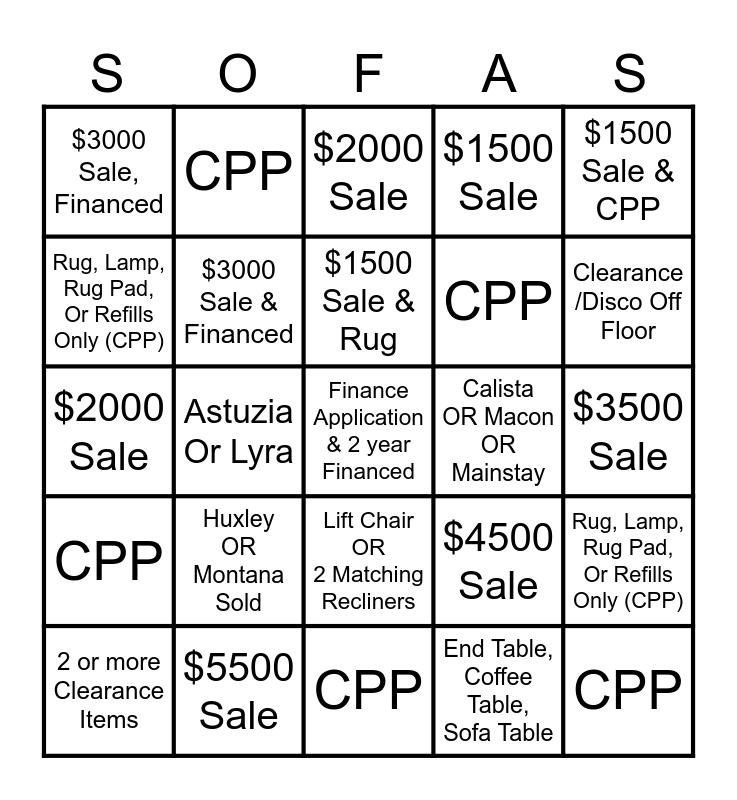 This bingo card has 25 words: CPP, $5500 Sale, Finance Application & 2 year Financed, End Table, Coffee Table, Sofa Table, $1500 Sale & CPP, $3000 Sale, Financed, CPP, $2000 Sale, Calista OR Macon OR Mainstay, Rug, Lamp, Rug Pad, Or Refills Only (CPP), Rug, Lamp, Rug Pad, Or Refills Only (CPP), $3000 Sale & Financed, CPP, $4500 Sale, Clearance /Disco Off Floor, 2 or more Clearance Items, Astuzia Or Lyra, $1500 Sale & Rug, CPP, $3500 Sale, $2000 Sale, Huxley OR Montana Sold, Lift Chair OR 2 Matching Recliners, $1500 Sale and CPP.