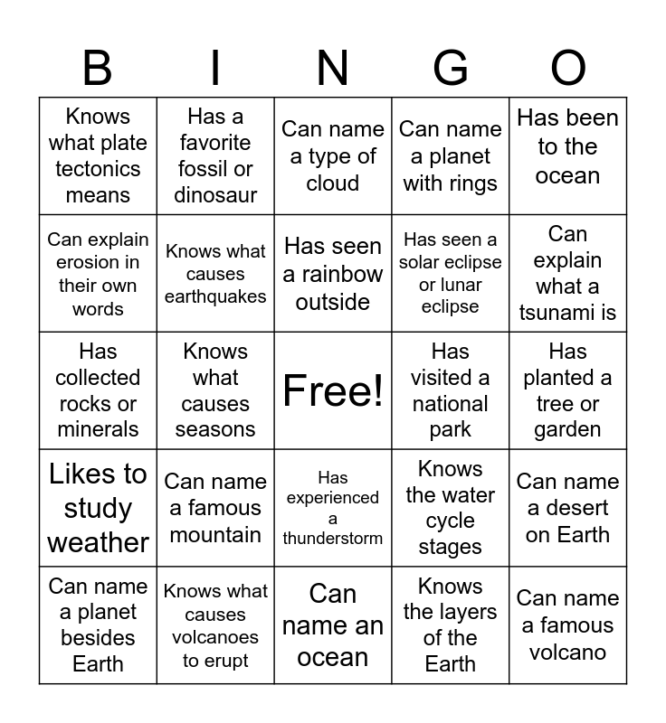 This bingo card has a free space and 34 words: Has visited a volcano, Knows the layers of the Earth, Can name three types of rocks, Has seen a meteor shower, Likes to study weather, Knows what causes earthquakes, Has been to the ocean, Can name a planet besides Earth, Has a favorite fossil or dinosaur, Knows what erosion means, Has seen a rainbow outside, Can name a type of cloud, Knows what fossils are made of, Has used a compass before, Has visited a national park, Can explain what a tsunami is, Knows what causes volcanoes to erupt, Has collected rocks or minerals, Can name a famous mountain, Knows the water cycle stages, Has experienced a thunderstorm, Can name one greenhouse gas, Knows what plate tectonics means, Has planted a tree or garden, Can name an ocean, Can name a famous volcano, Can name a planet with rings, Knows what causes wind, Has seen a solar eclipse or lunar eclipse, Can explain erosion in their own words, Has visited a cave or cavern, Knows what causes seasons, Can name a desert on Earth and Can name a type of renewable energy.