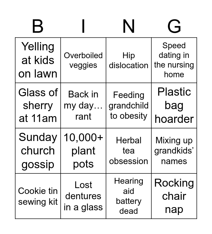 This bingo card has 16 words: Lost dentures in a glass, Mixing up grandkids’ names, Hip dislocation, Yelling at kids on lawn, Sunday church gossip, Overboiled veggies, Herbal tea obsession, Hearing aid battery dead, Glass of sherry at 11am, Back in my day… rant, Cookie tin sewing kit, Speed dating in the nursing home, 10,000+ plant pots, Plastic bag hoarder, Feeding grandchild to obesity and Rocking chair nap.