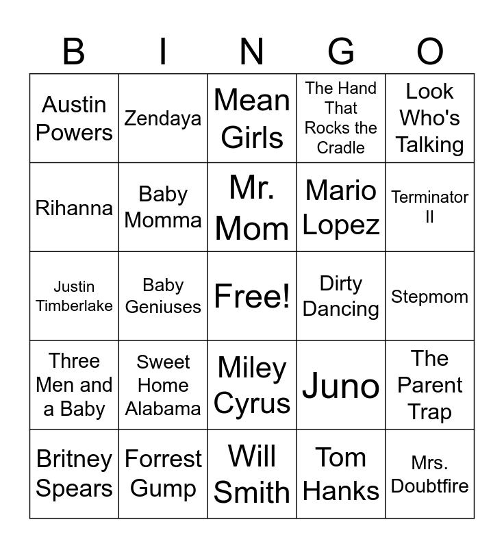 This bingo card has a free space and 36 words: Baby's Day Out, Knocked Up, Boss Baby, Baby Momma, Juno, Three Men and a Baby, Mr. Mom, Life As We Know It, Look Who's Talking, Rosemary's Baby, Baby Geniuses, The Hand That Rocks the Cradle, Father of the Bride II, Dirty Dancing, Terminator II, Austin Powers, Pretty Woman, Sweet Home Alabama, Mrs. Doubtfire, Mean Girls, Stepmom, The Parent Trap, Forrest Gump, Britney Spears, Will Smith, Zendaya, Justin Timberlake, Brad Pitt, Mario Lopez, Rihanna, Justin Bieber, Kelly Ripa, Tom Hanks, Miley Cyrus, George Clooney and Leonardo Di Caprio.