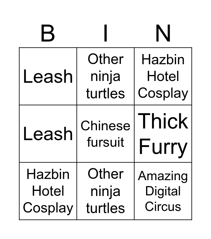 ⚠ This card has duplicate items: Quadsuit (2), Thick Furry (2), Hazbin Hotel Cosplay (2), Furry flirts with Marcel (2), Chinese fursuit (2), Kaue absolutely gives up (2), Leash (2), Other ninja turtles (2), Amazing Digital Circus (2)