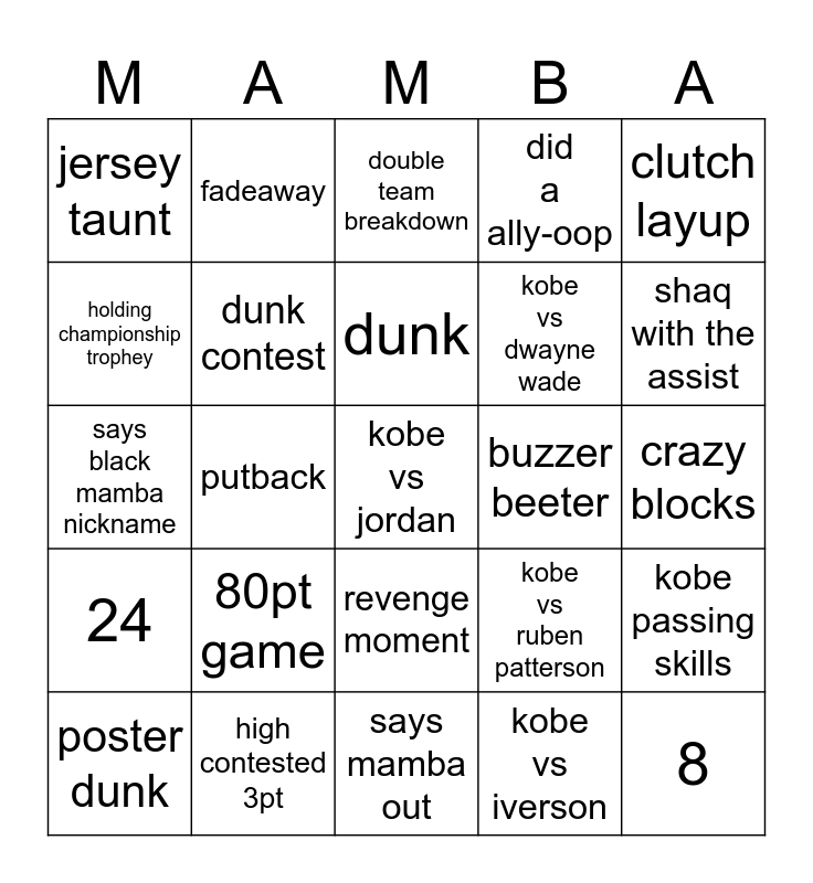 This bingo card has a free space and 24 words: 80pt game, high contested 3pt, dunk, poster dunk, clutch layup, jersey taunt, holding championship trophey, fadeaway, buzzer beeter, revenge moment, kobe vs dwayne wade, says black mamba nickname, kobe vs ruben patterson, kobe passing skills, dunk contest, kobe vs iverson, crazy blocks, double team breakdown, shaq with the assist, putback, 8, 24, did a ally-oop and says mamba out.